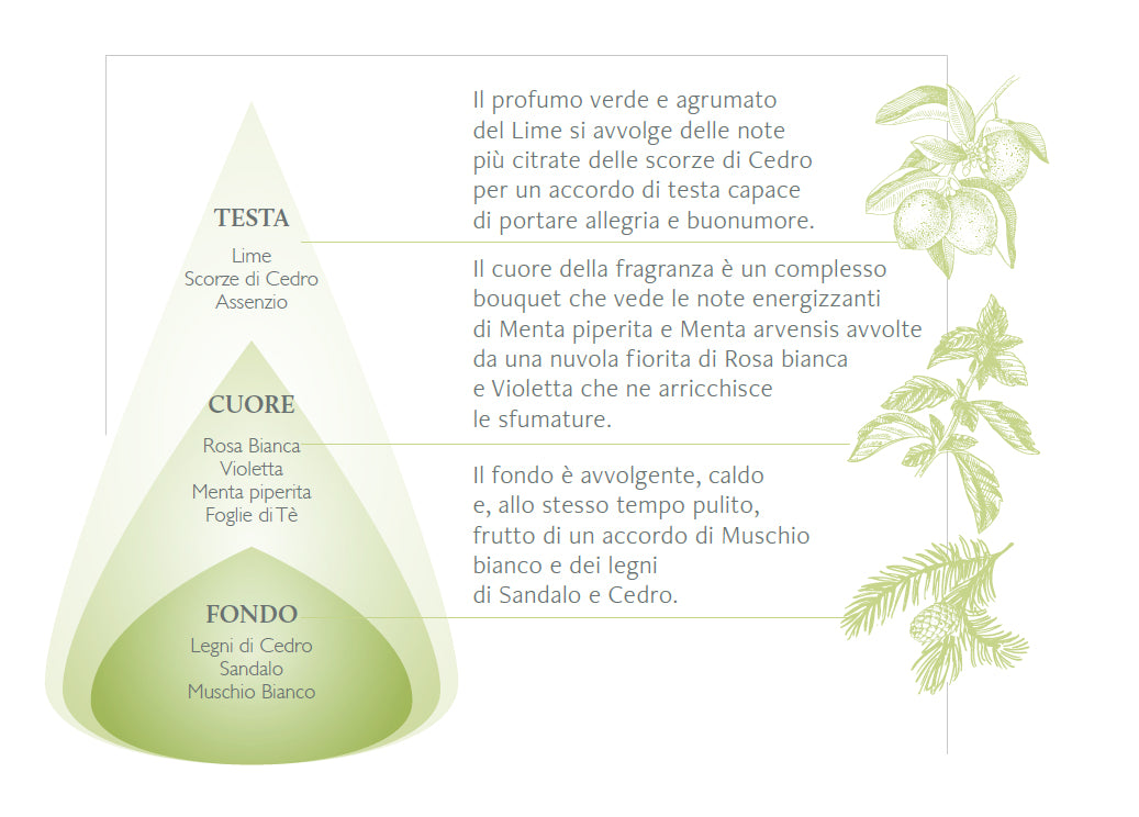 Una brezza leggera scuote i rami dei cespugli di Menta liberando nell’aria l’inconfondibile aroma fresco e stimolante che, con le note verdi, agrumate e dal tocco esotico del Lime, crea un’armonia olfattiva che ci trasporta in una stagione in cui la natura si risveglia in tutta la sua grandezza, avvolgendoci con i suoi profumi di benessere.