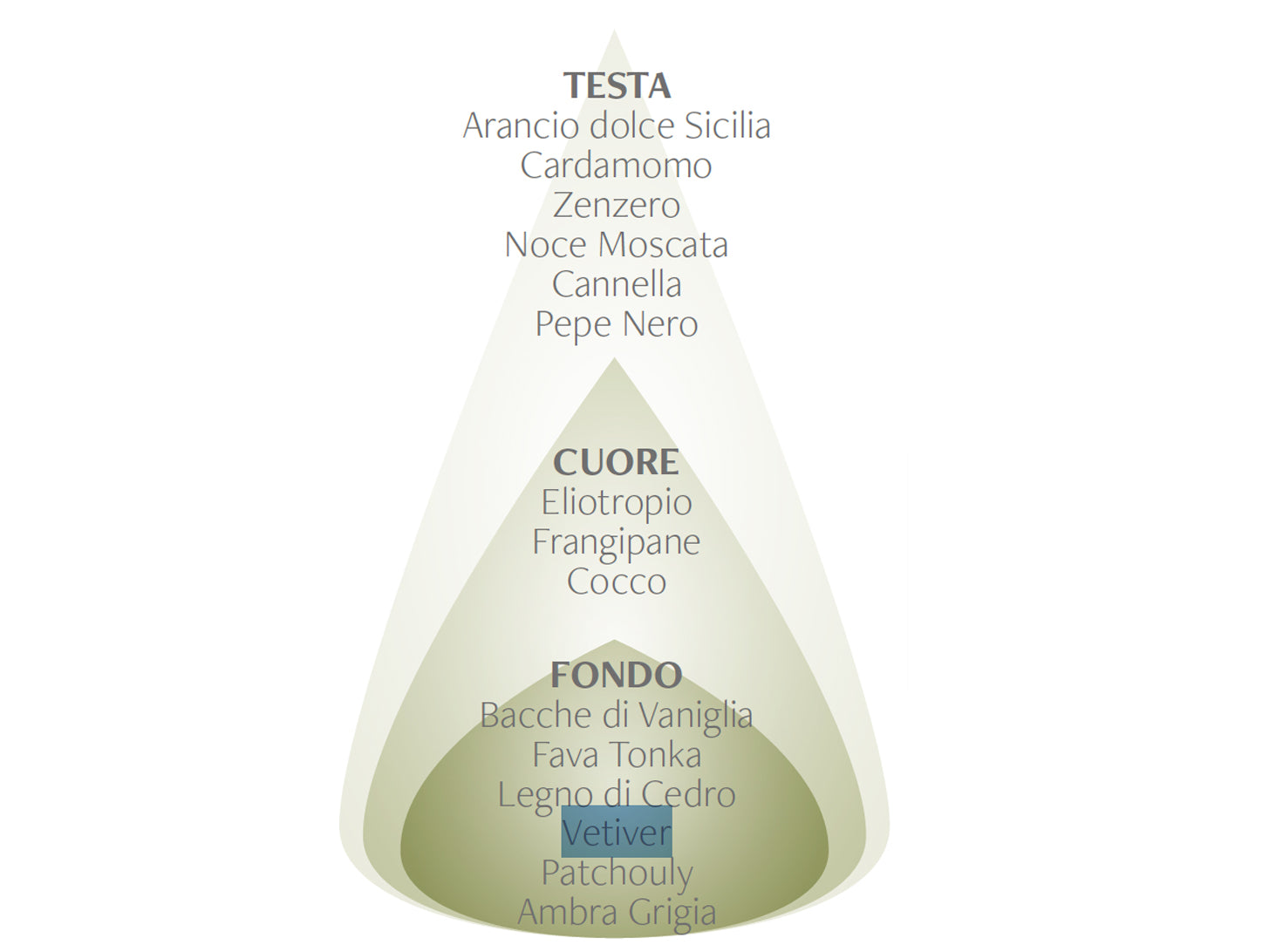 Un’apertura vivace e stimolante accordo tra l’Arancio dolce di Sicilia e le sfumature calde e vibranti delle spezie di Cannella, Zenzero e Cardamomo. Nel cuore i sentori del cocco incontrano la morbidezza floreale dell’Eliotropio e del Frangipane. Il fondo, profondo e avvolgente, la dolcezza avvolgente della Fava Tonka si intreccia alle note secche e terrose del Vetiver, arricchite da sfumature calde e resinose che donano equilibrio e intensità.