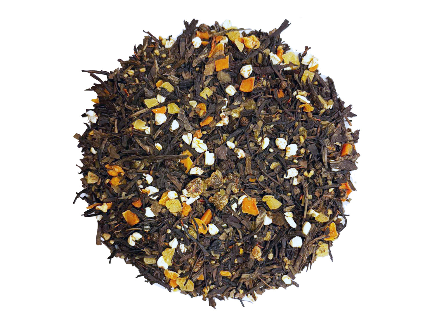 Con: tè nero Black Sencha, pezzetti di albicocca (albicocca, farina di riso), pezzetti di zenzero, scaglie di carote, grano saraceno soffiato, aroma, grano saraceno tostato, pepe, cardamomo, foglie dolci di mora, cartamo.