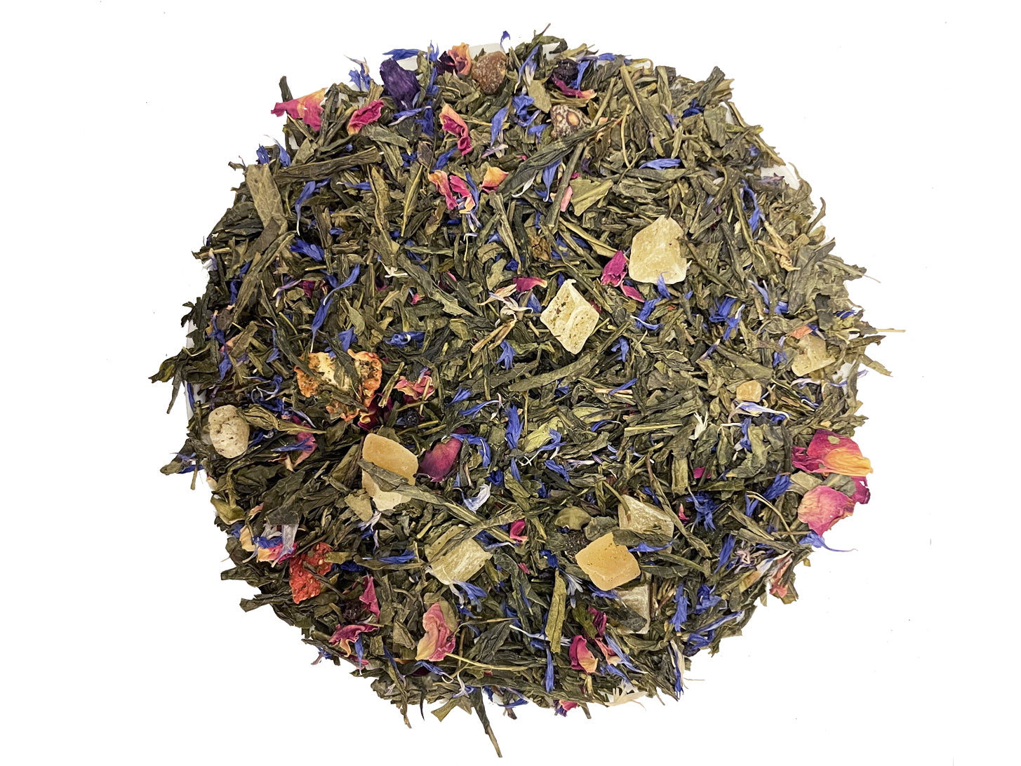 Con: tè verde sencha cinese, ananas, papaya, albicocca, fragola, malva, mirtillo, petali di rosa, aromi.