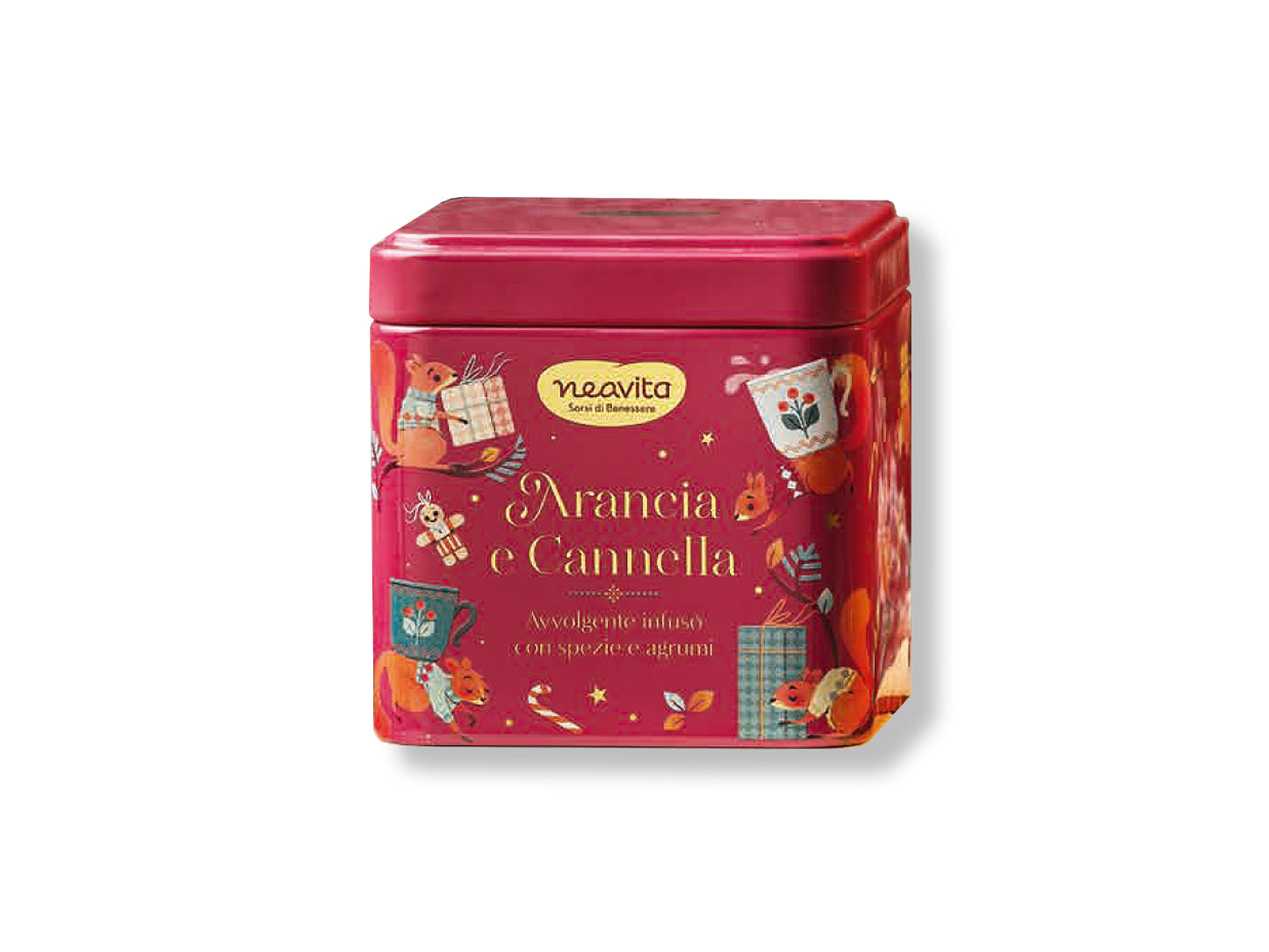 Un grazioso "mini" barattolo a tema natalizio contenente 5 piramidi filtro di infuso "Arancia e Cannella": riscaldante e rasserenante, un infuso che avvolge grazie al sapore speziato della Cannella ed ai toni mediterranei degli Agrumi. La morbidezza è nei profumi del Cocco e la forza nei sentori di Rosa Canina. Per un momento di profondo benessere dedicato a chi cerca conforto e calore.