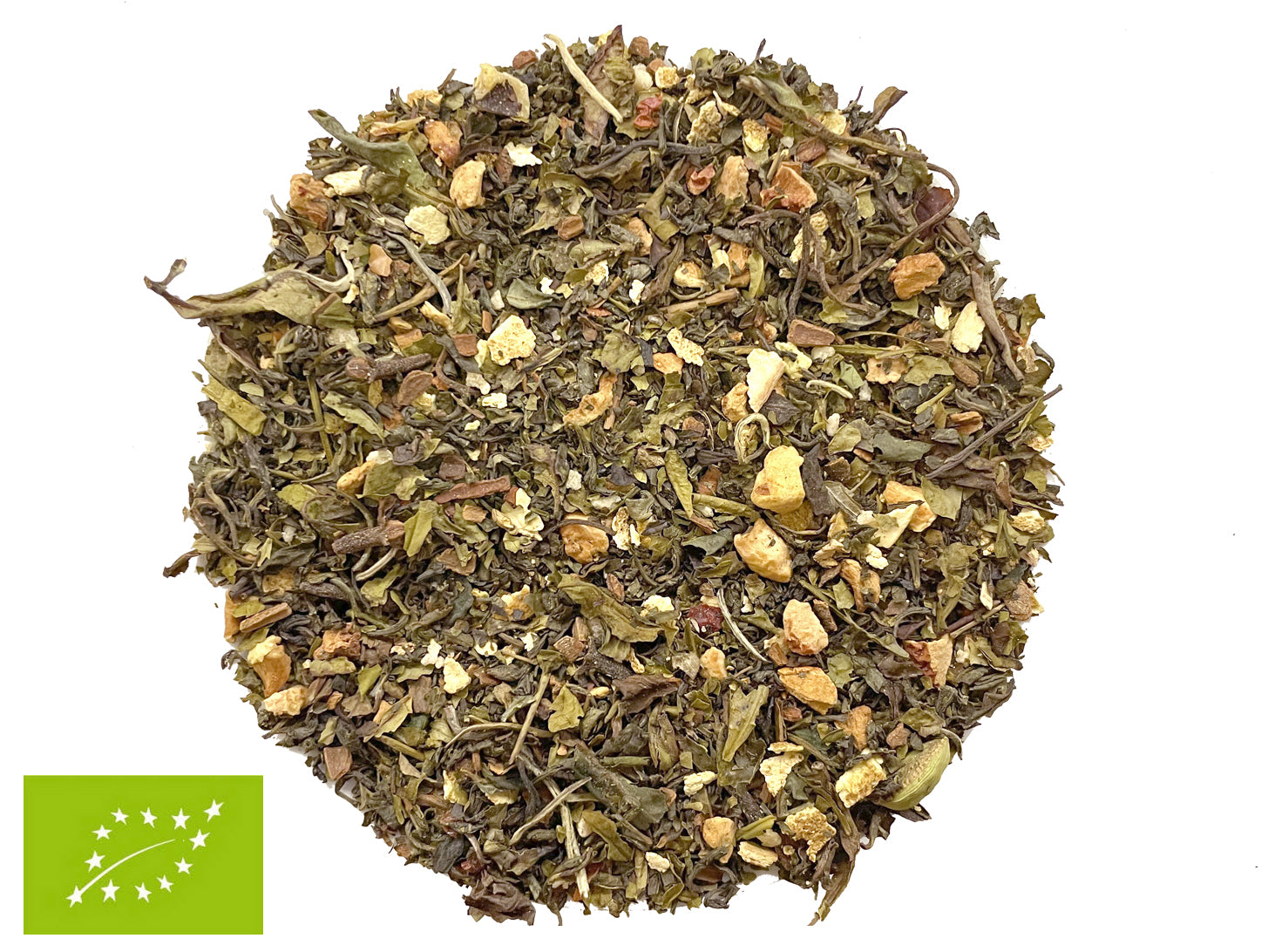 Con: tè bianco, tè verde, mela, arancia, cannella, zenzero, chiodi di garofano, noci e cardamomo. Con Aromi Naturali