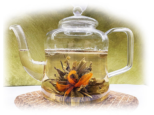 Un tè "romantico" che libera lentamente in acqua due "torri" di gelsomino e un bocciolo di rosa.