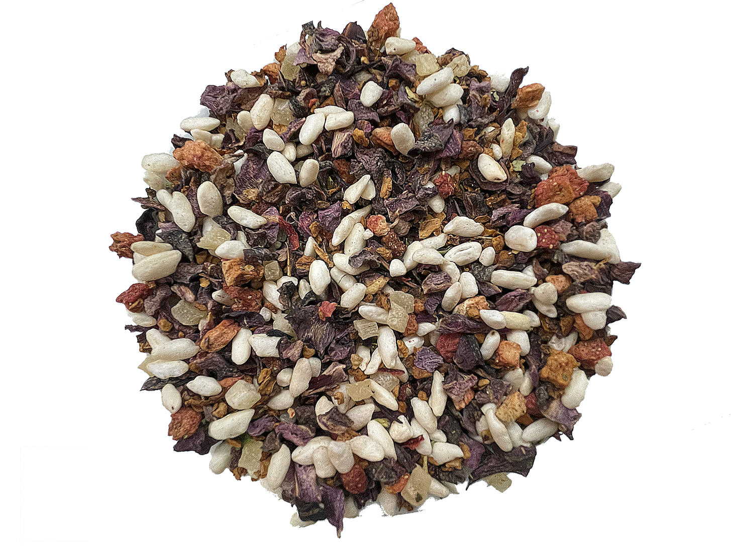 Con:carota viola, Mela, Ananas candito (ananas, zucchero, acido citrico), Ibisco, Stevia, Riso soffiato, Aroma, Fragola, Lampone granulato (sciroppo di glucosio, zucchero, lamponi, alginato di sodio), aroma naturale.