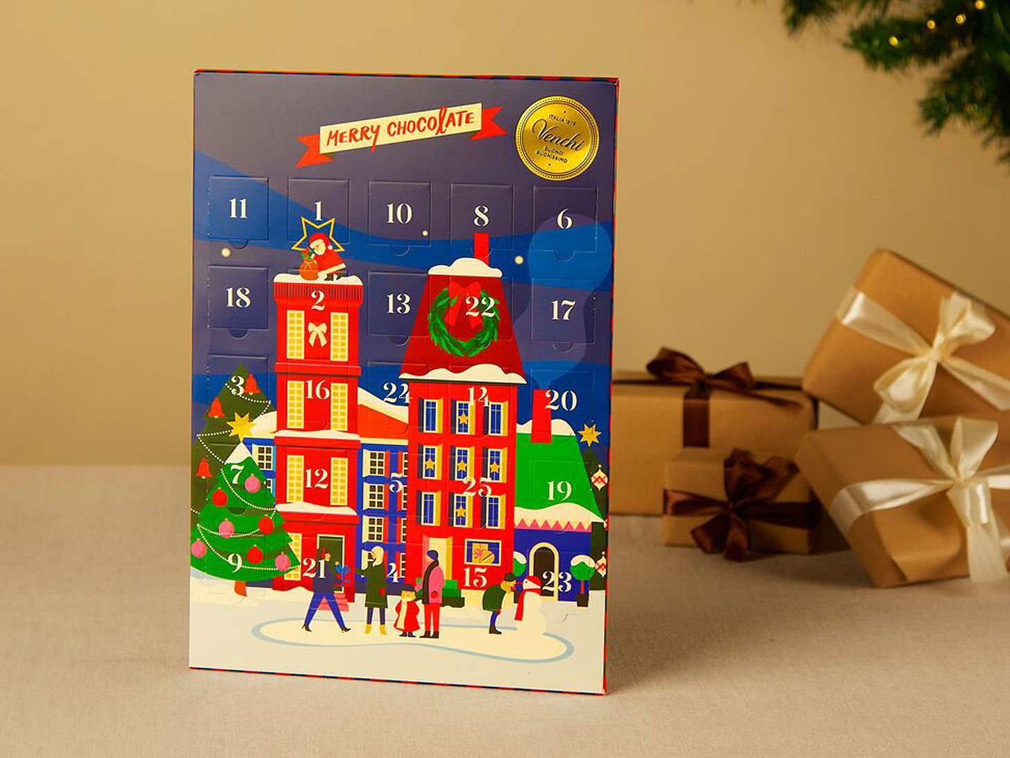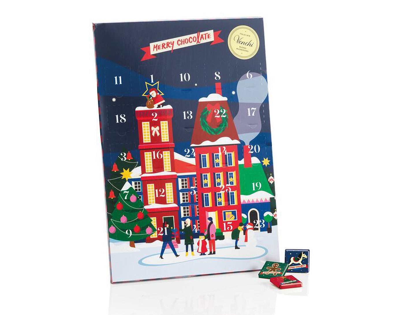 Calendario dell’Avvento Classico con 25 finestrelle ognuna delle quali contenente un cioccolatino della linea "Grand Blend di Natale Venchi" (tipo Napolitain) latte e fondente.