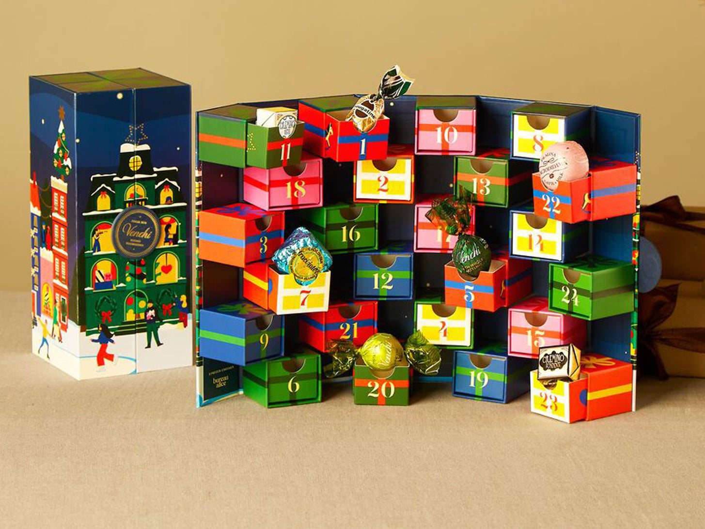 Calendario dell’Avvento Prestige, richiudibile, con assortimento di 29 deliziosi cioccolatini iconici Venchi di altissima qualità disposti in 24 cassettini.