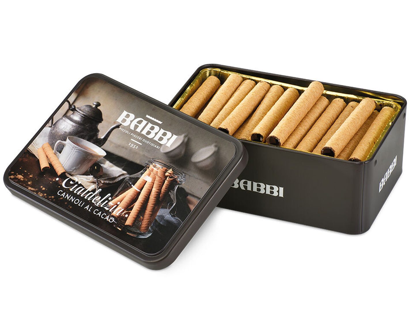 I Cannoli Babbi sono fragranti cialde arrotolate che racchiudono uno strato di finissimo cioccolato. La latta Piccoli Piaceri è l'idea perfetta per un regalo originale e goloso.