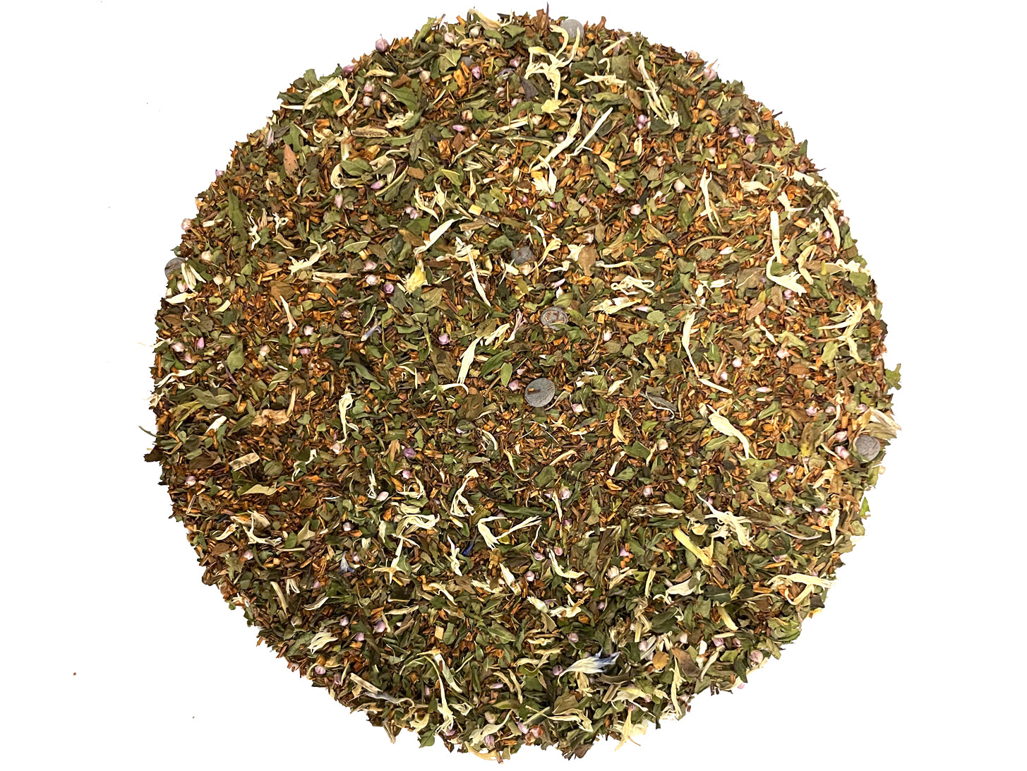 Con: rooibos, menta, gocce di cioccolato (contiene latte e soia) e petali di fiori. Con aromi naturali