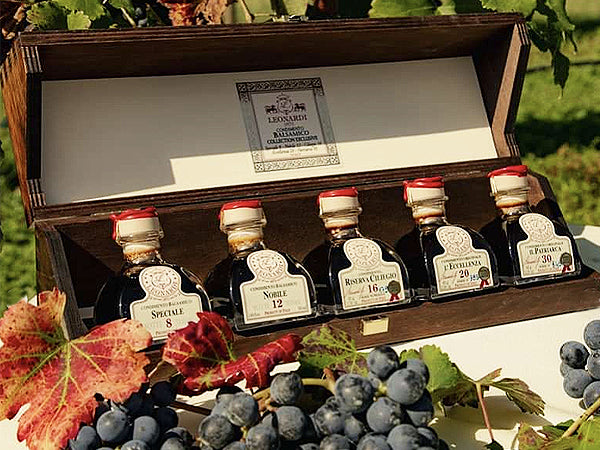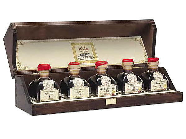 un prezioso cofanetto in legno contenente 5 bottigliette sagomate a calamaio con pregiate selezioni di originale aceto balsamico di Modena Acetaia Leonardi