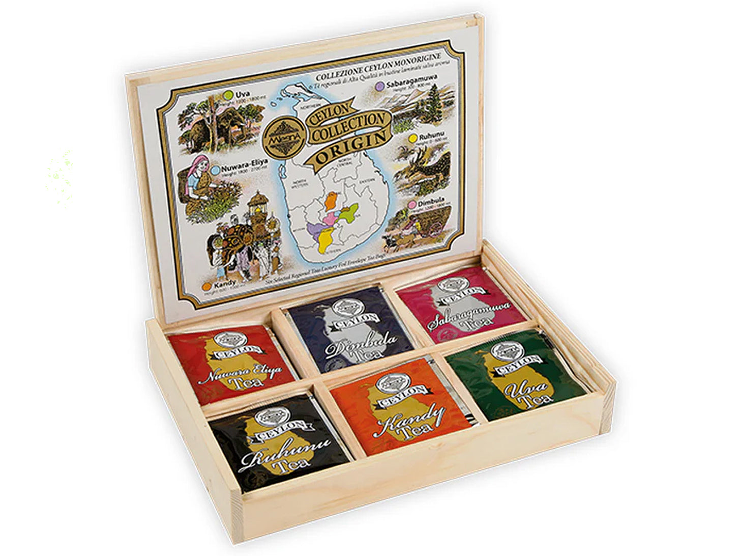 Questo prezioso cofanetto di legno contiene una collezione di tè puri di Ceylon monorigine pensata per chi vuole fare una degustazione in purezza attraverso sei principali regioni produttrici dello Sri Lanka. Ideale per assaporare tè neri diversi fra loro nel carattere, nei sapori e profumi, coltivati a temperature, altitudini e caratteristiche climatiche differenti.