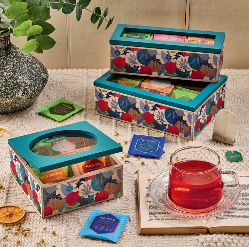 Ogni cofanetto contiene tisane e infusi custoditi ognuno nella propria bustina di carta decorata. I filtri sono interamente biodegradabili.