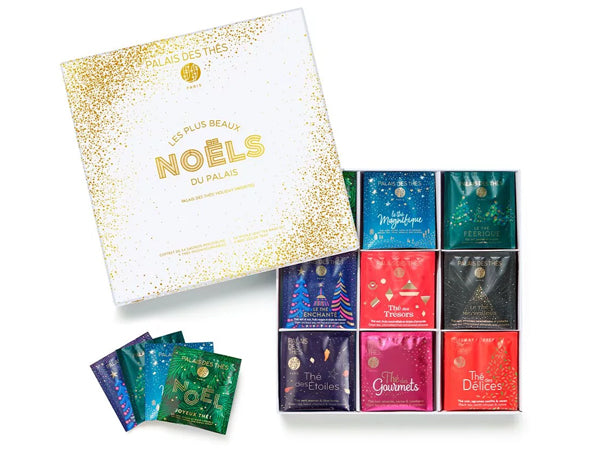 Il cofanetto LES PLUS BEAUX NOËLS DU PALAIS contiene 6 bustine filtro per nove specialità differenti dei migliori tè e infusi di tutte le stagioni natalizie celebrate dalla maison francese Palais des Thés