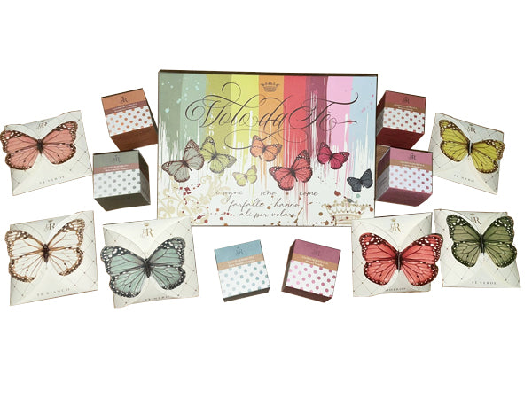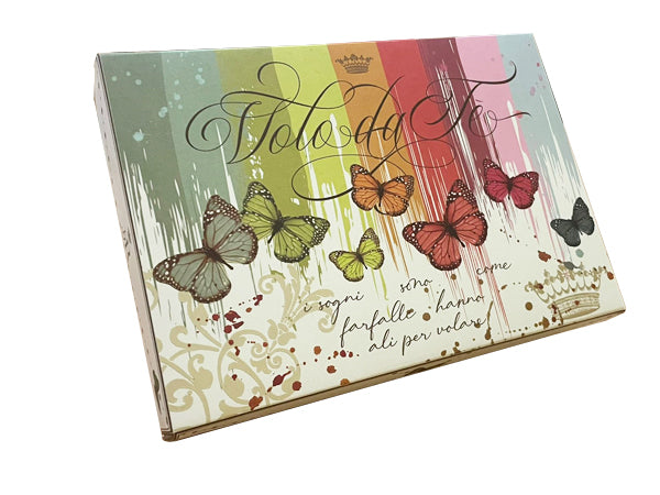 Un originale e colorato cofanetto contenente i filtri piramidali racchiusi elegantemente ciascuno in una piccola custodia di cartoncino decorato, e filtri "cristal" racchiusi in un'originale confezione a forma di farfalla colorata.