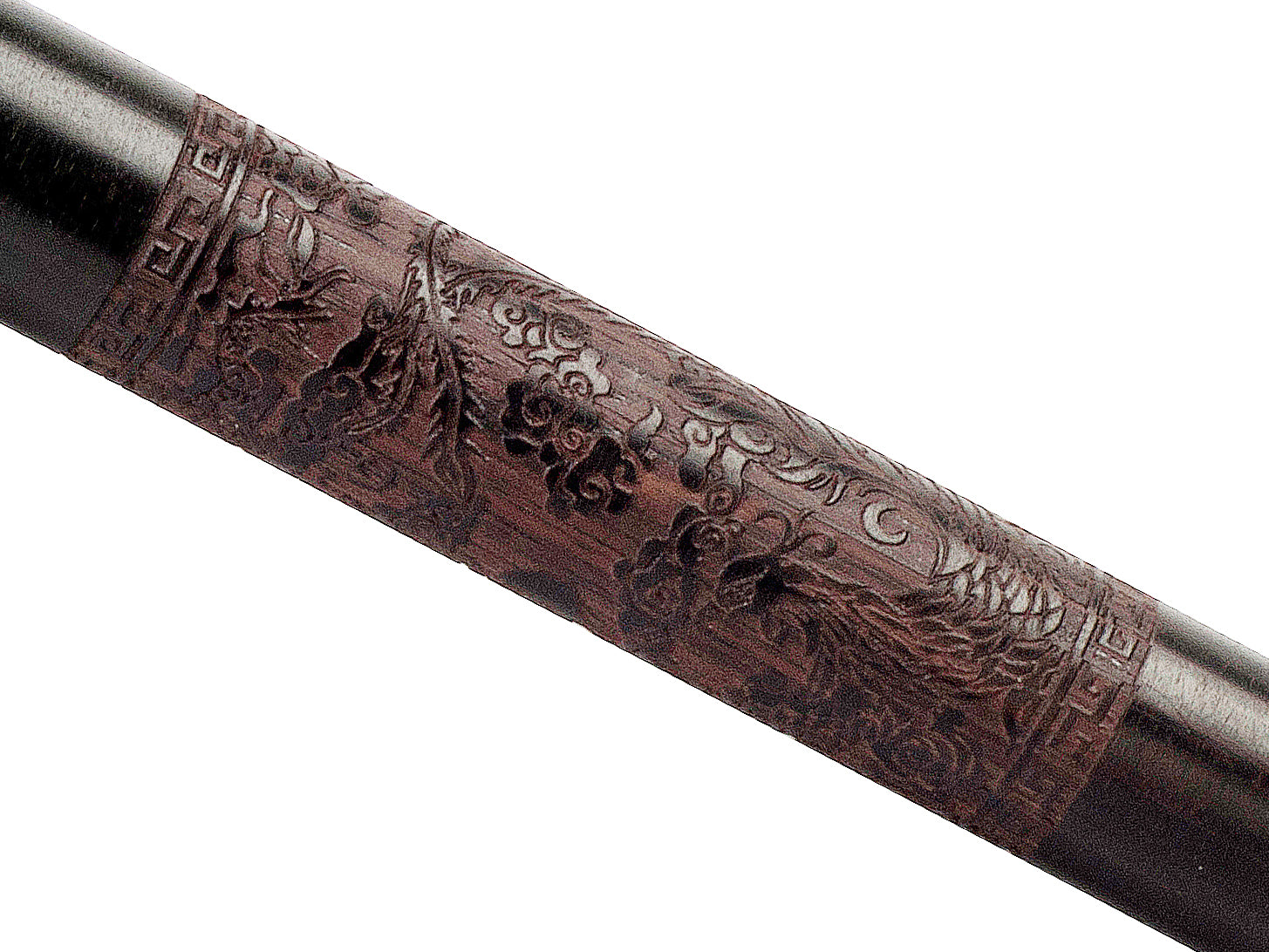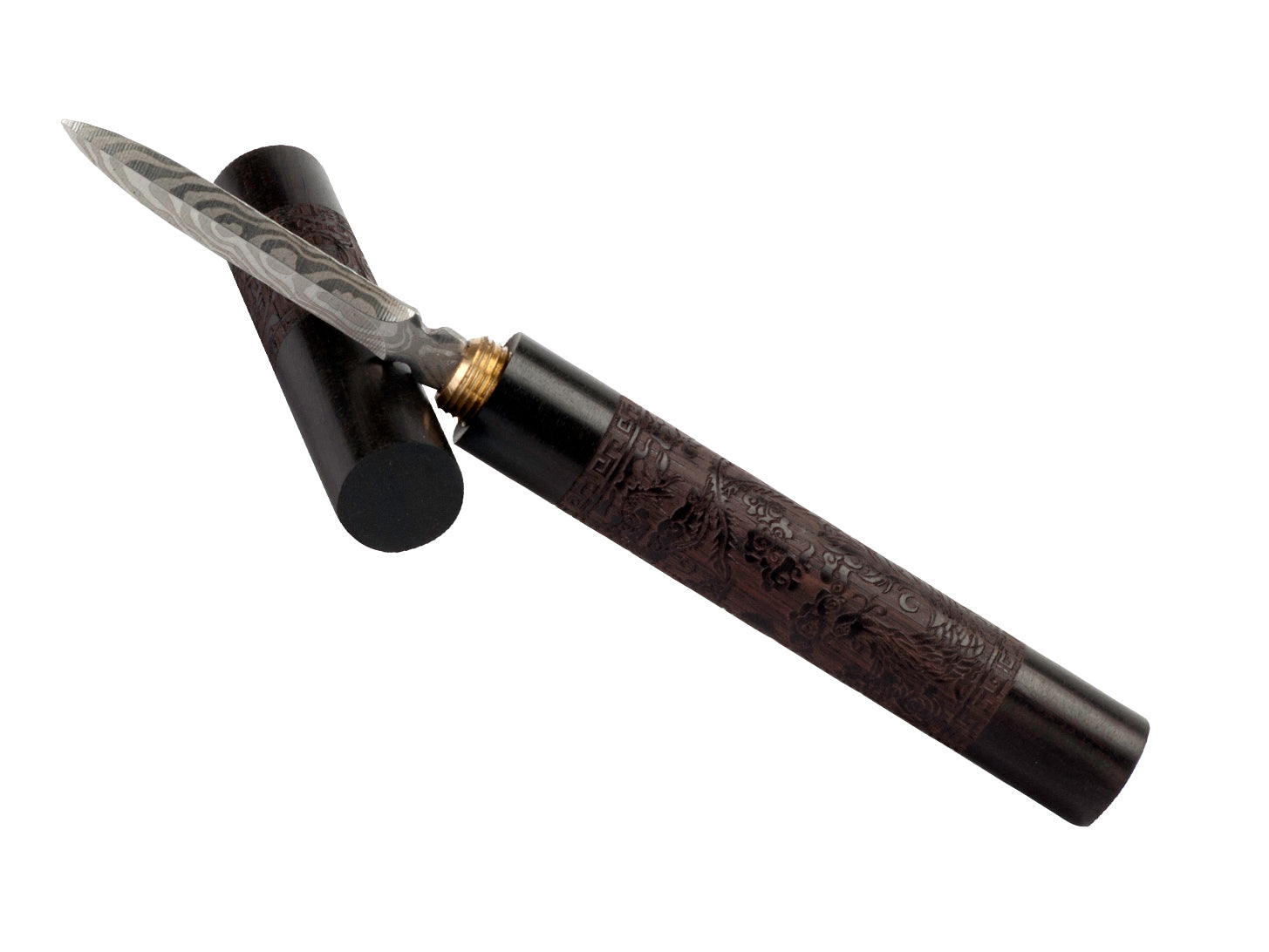 Un coltello da tè Pu-erh di alta qualità spesso e resistente. È realizzato in legno di ebano massiccio. La forma rotonda e l'importante spessore gli conferiscono una meravigliosa presa ergonomica. La lama è in acciaio inossidabile con motivo damascato.