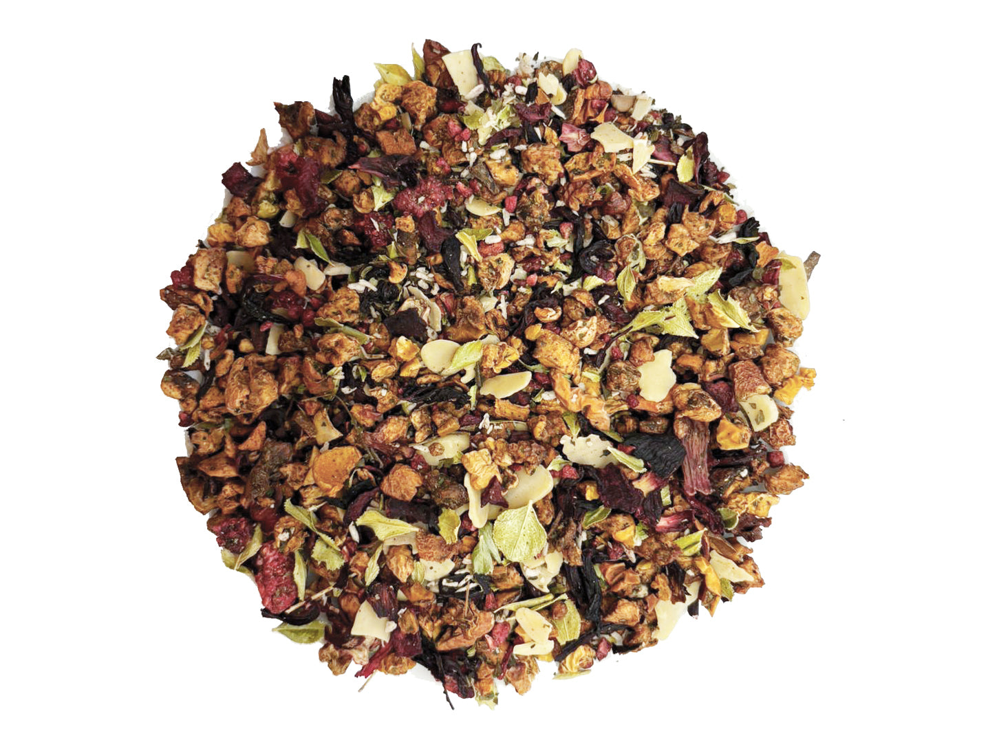 Con: mela , cocco, ibisco, mandorle, barbabietola, foglie dolci di mora, aroma, lamponi liofilizzati, cannella, foglie di bucco.