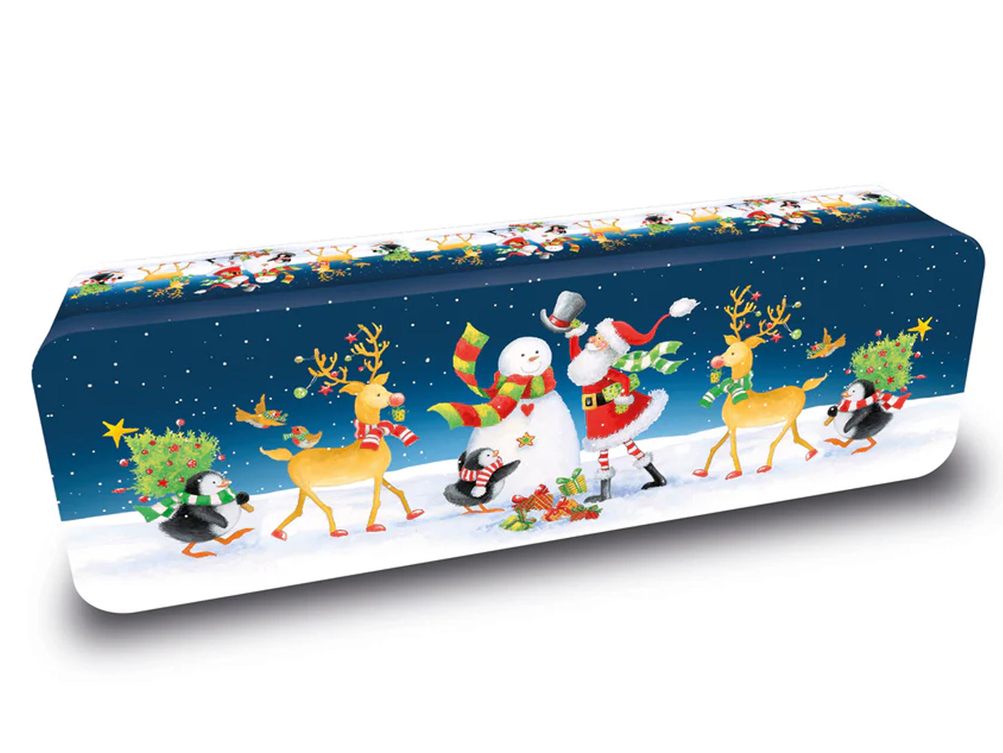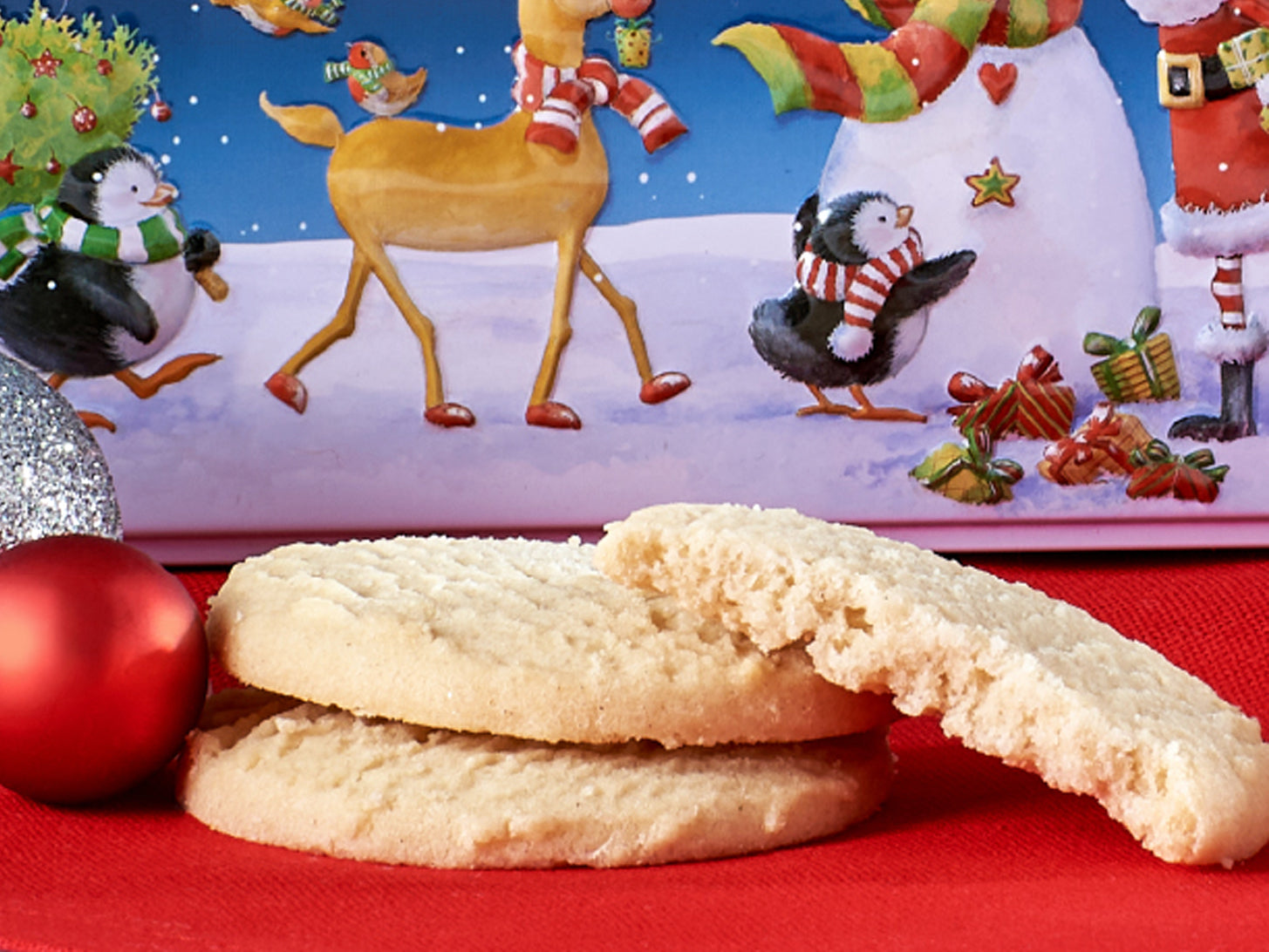 Lattina con particolari natalizi in rilievo piena di biscotti alla panna originali scozzesi.