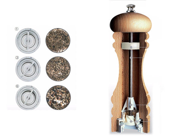 Macina sale o pepe dalla forma classica di medie dimensioni con macina in ceramica e ghiera di regolazione immediata per lo spessore. La macina in ceramica è tra le più dure esistenti e longeve nel tempo, garantisce così precisione e non arrugginisce.