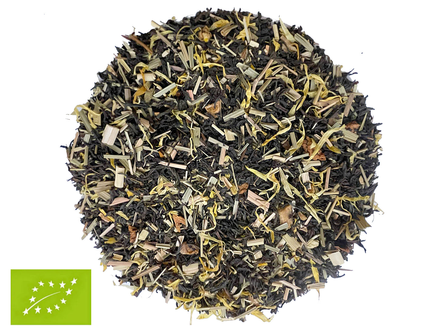 Con: blend di tè neri, mela, mango, zenzero, papaya, ciliegie, ananas, olio essenziale di limone.