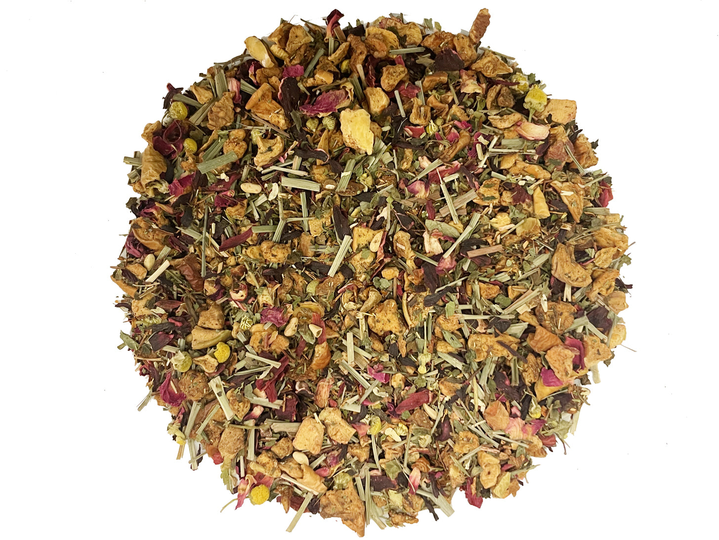 Con: mela, ibisco, melissa, rooibos, lemongrass, camomilla, petali di rosa, stevia, arilli di melograno, estratto di kombucha, aromi.