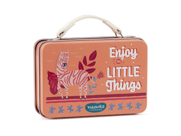 Una graziosa "mini valigetta con una simpatica frase tematica contenente 4 piramidi filtro di infuso "GIOIA DI VITA": un brioso insieme di Ibisco Lemongrass e Mandarino ideale in ogni momento della giornata.