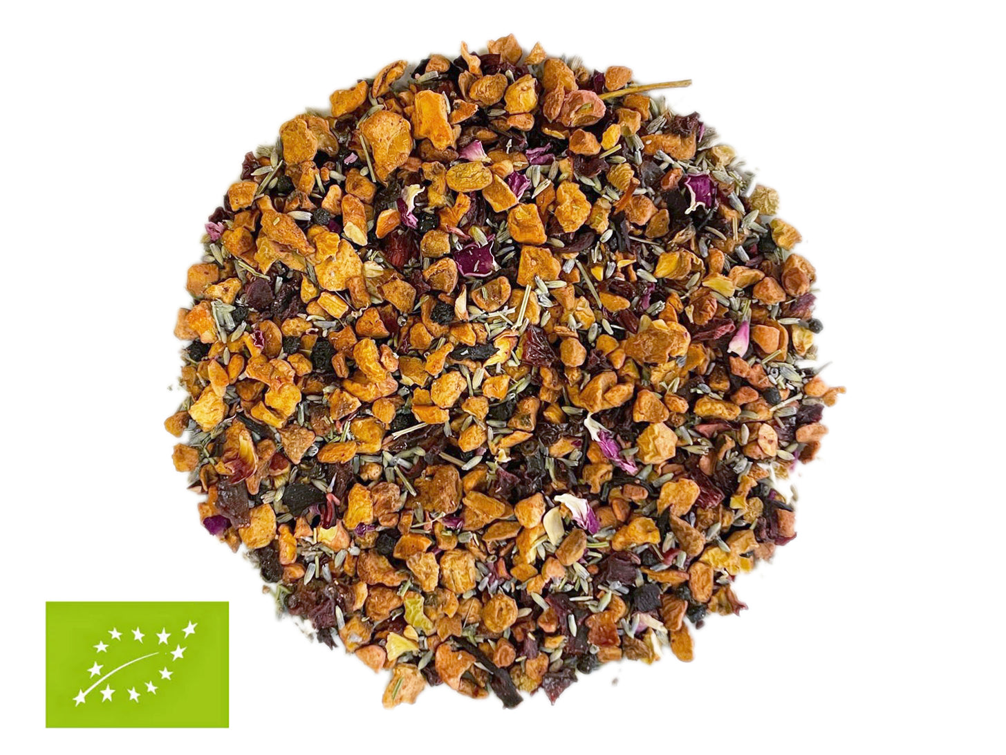 Con: mela, barbabietola rossa, rosa canina, lavanda, ibisco, aroma naturale di mirtilli e more, bacche di sambuco, mirtilli, petali di rosa