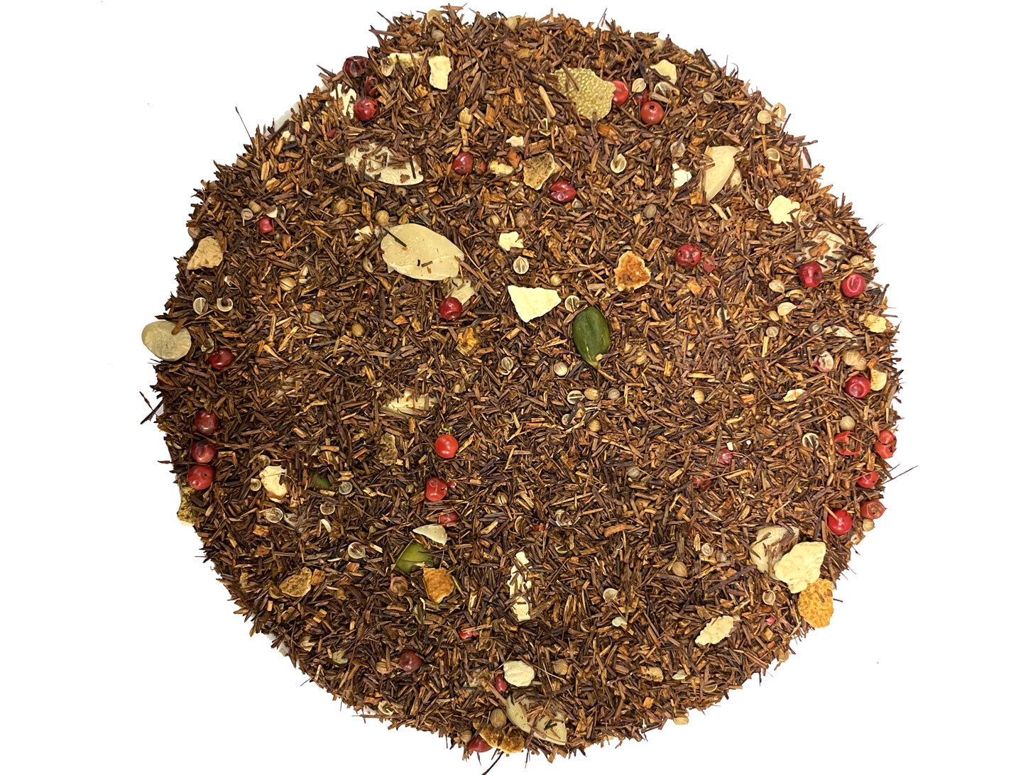 Con: rooibos, mandorle, pistacchi, scorze d'arancio, coriandolo, pepe rosa, aromi.