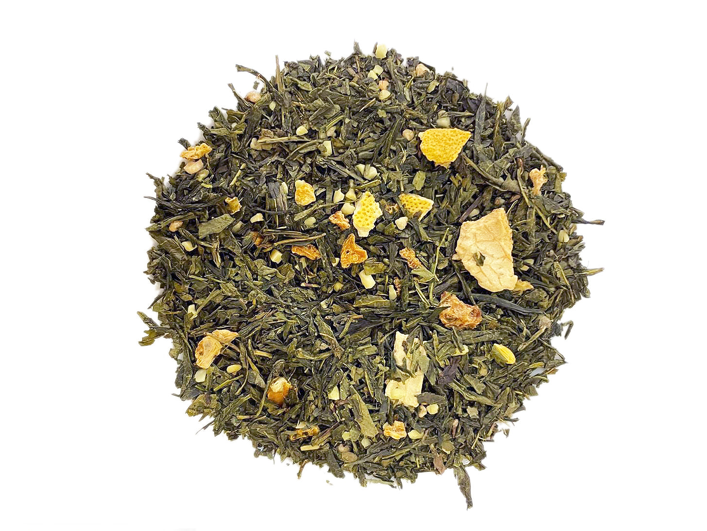 Con: tè verde 77%, mandorle, scorza di limone, zuccherini alla nocciola, aromi.