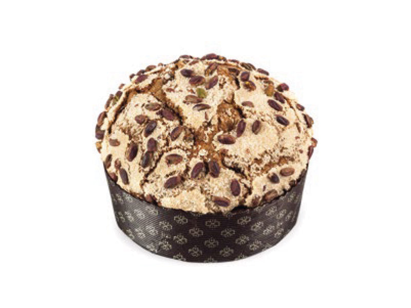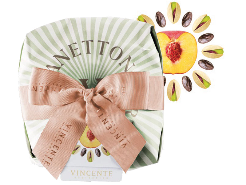 Panettone a lievitazione naturale con pistacchio di Sicilia, pesca candita e gocce di cioccolato extrafondente 70% (senza uvetta e senza canditi)