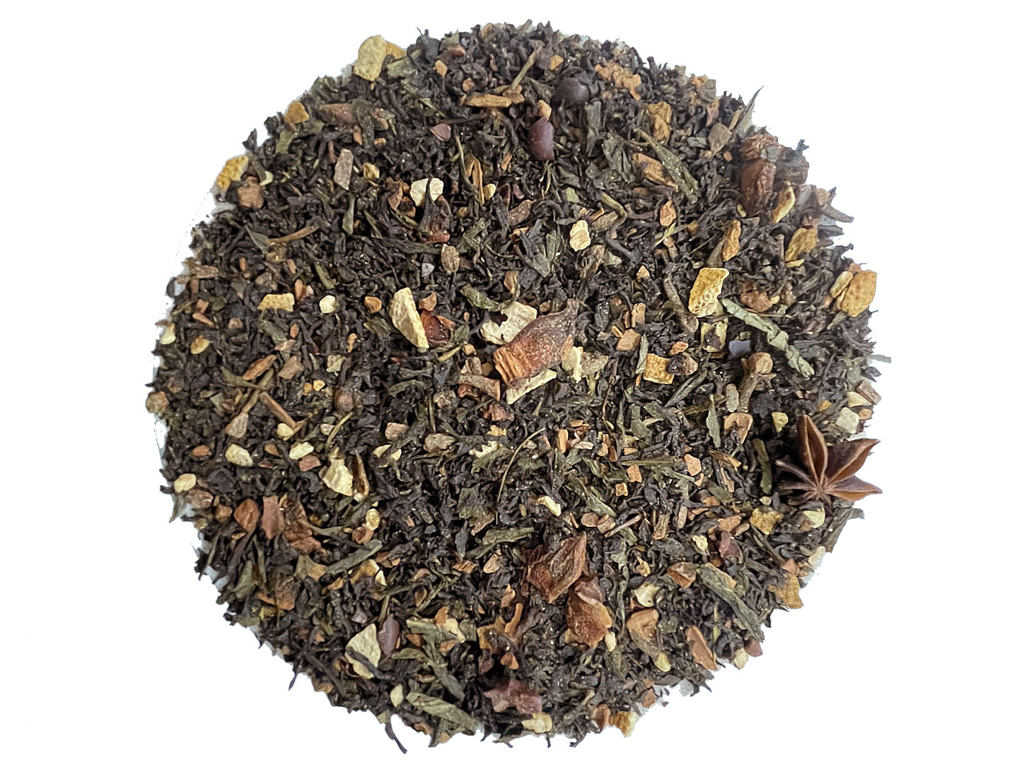 Con: blend di tè neri, cannella, tè verde, anice, arancia, fave di cacao, chiodi di garofano, coriandolo, cumino, finocchio, anice, noce moscata, cardamomo, vaniglia