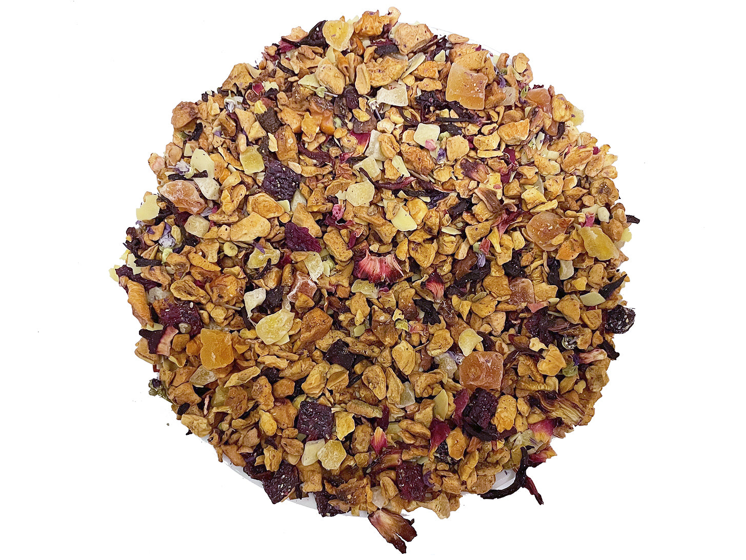 Con: mele tostate, ibisco, mirtilli, mandorle, dragon fruit, mango, papaya e petali di fiori.