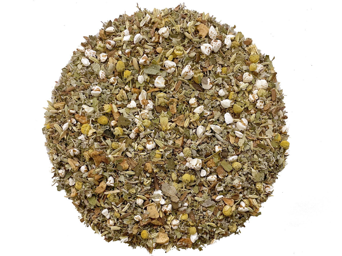 Con: finocchio, mela, grano saraceno soffiato, anice, cannella, camomilla, salvia e aromi di miele e vaniglia.