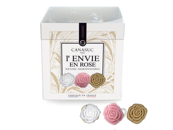 48 zollette a forma di rosa prodotte con puro zucchero di canna e coloranti esclusivamente derivati da frutta e verdura (rapa, mela, ribes); sono incartate singolarmente.