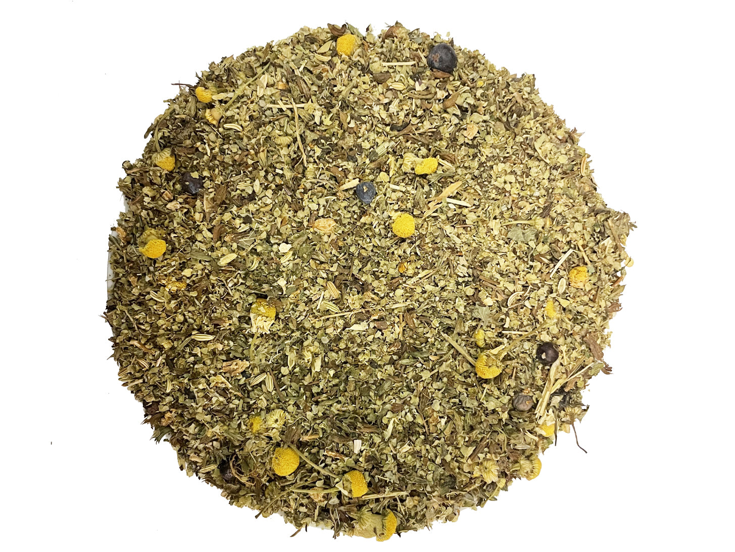 Con: maggiorana, angelica, finocchio, melissa, ginepro, menta piperita, camomilla.