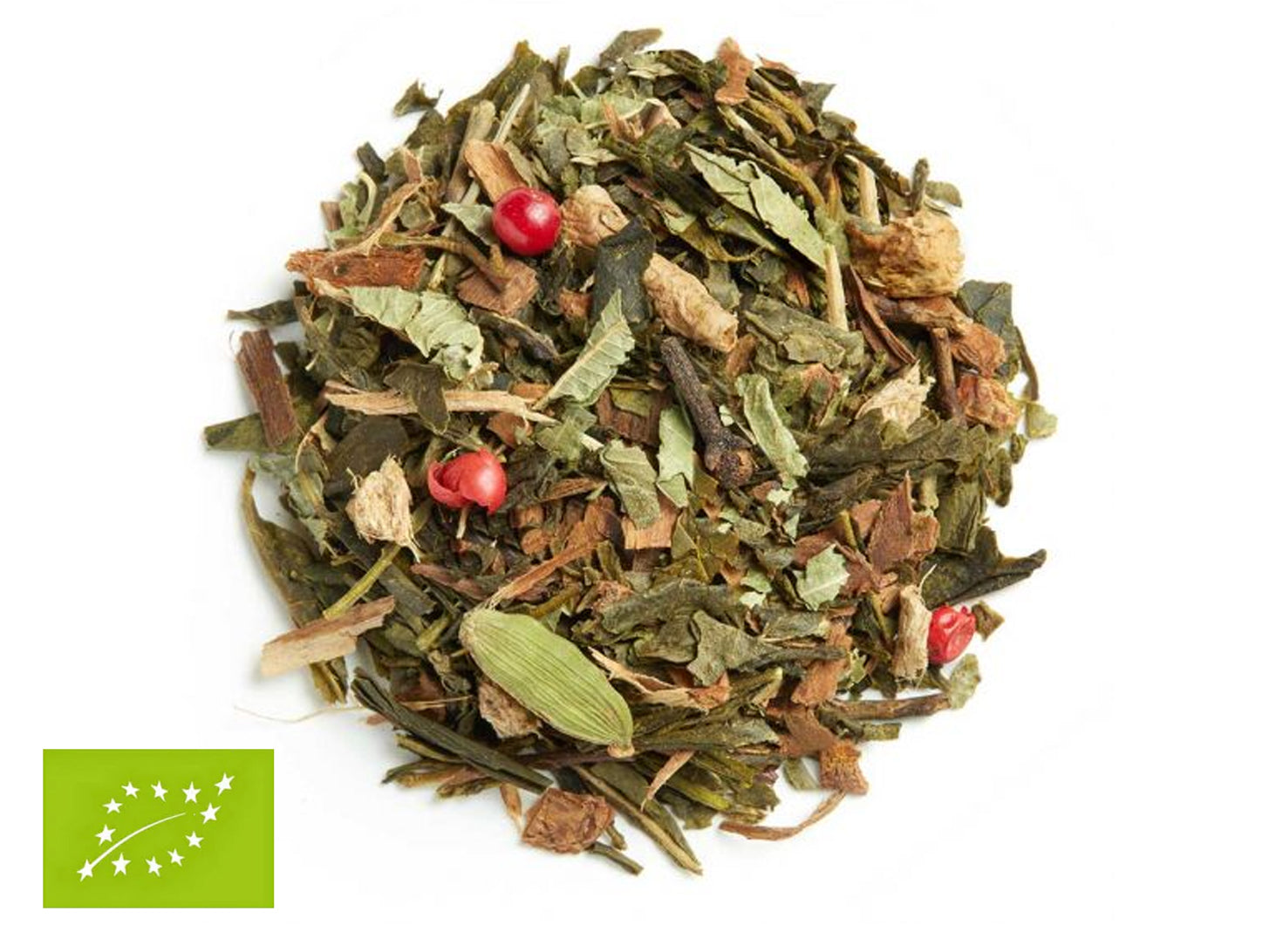 Ingredienti: tè verde, cannella, cardamomo, zenzero, verbena, pepe rosa, chiodi di garofano, olio essenziale di limone, cannella e chiodi di garofano.