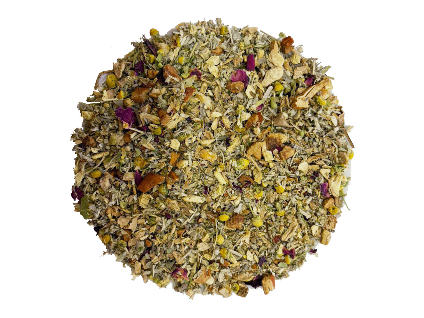 Con: zenzero, mela, foglie di salvia, camomilla, radici di liquirizia, fiori di tiglio, petali di rosa. SENZA AROMI