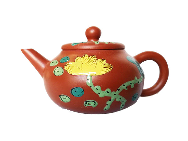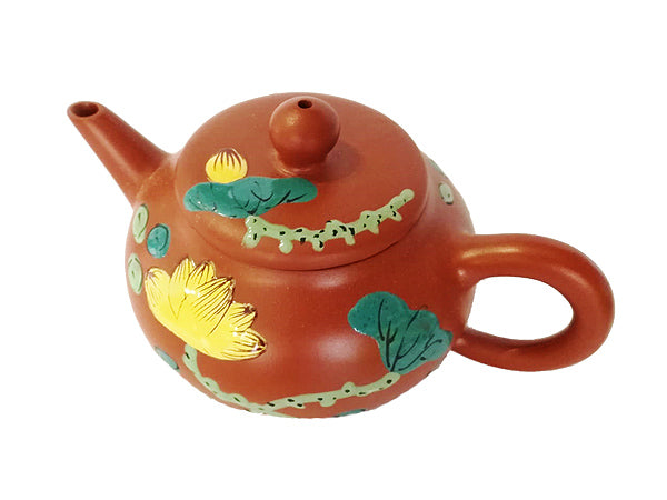 Teiera in argilla grezza originale Yixing con particolari floreali smaltati con diverse colorazioni.