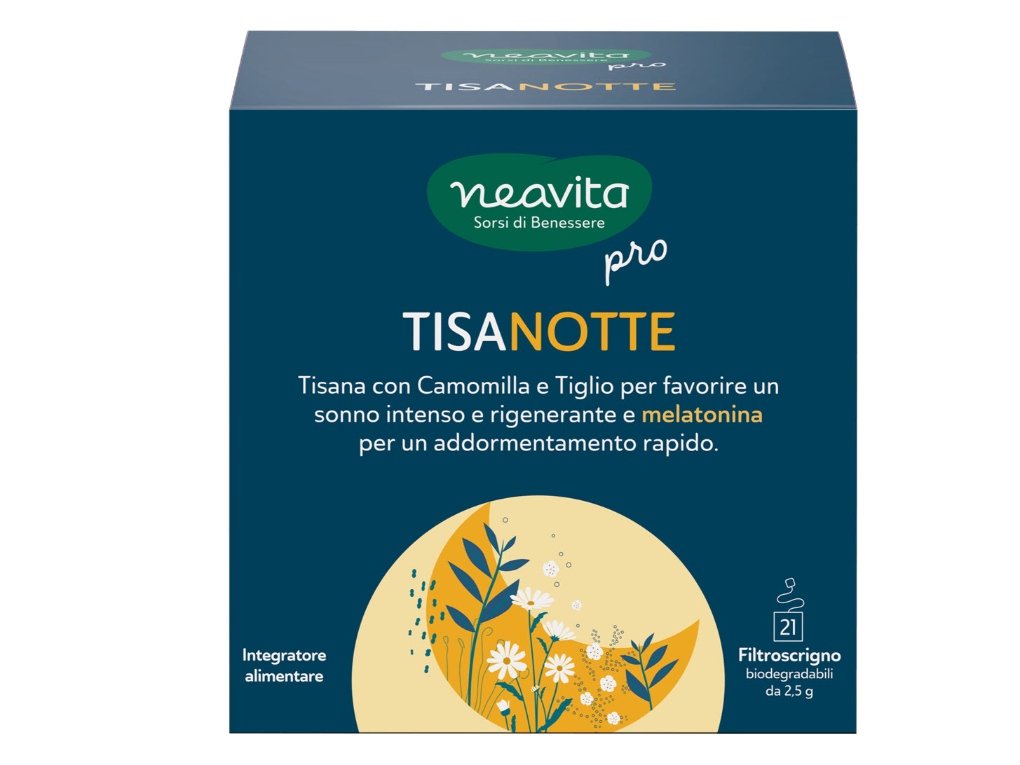 Tisanotte, grazie ai principi attivi di Camomilla, Tiglio e Biancospino in combinazione con Melatonina e complesso Vitaminico B coadiuva le diverse fasi del sonno favorendo un riposo rigenerante.