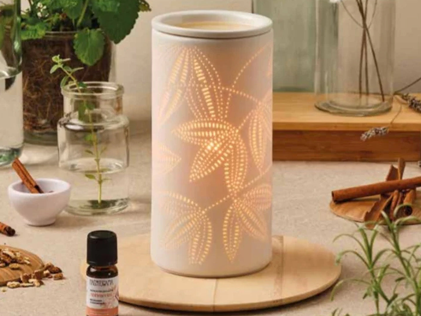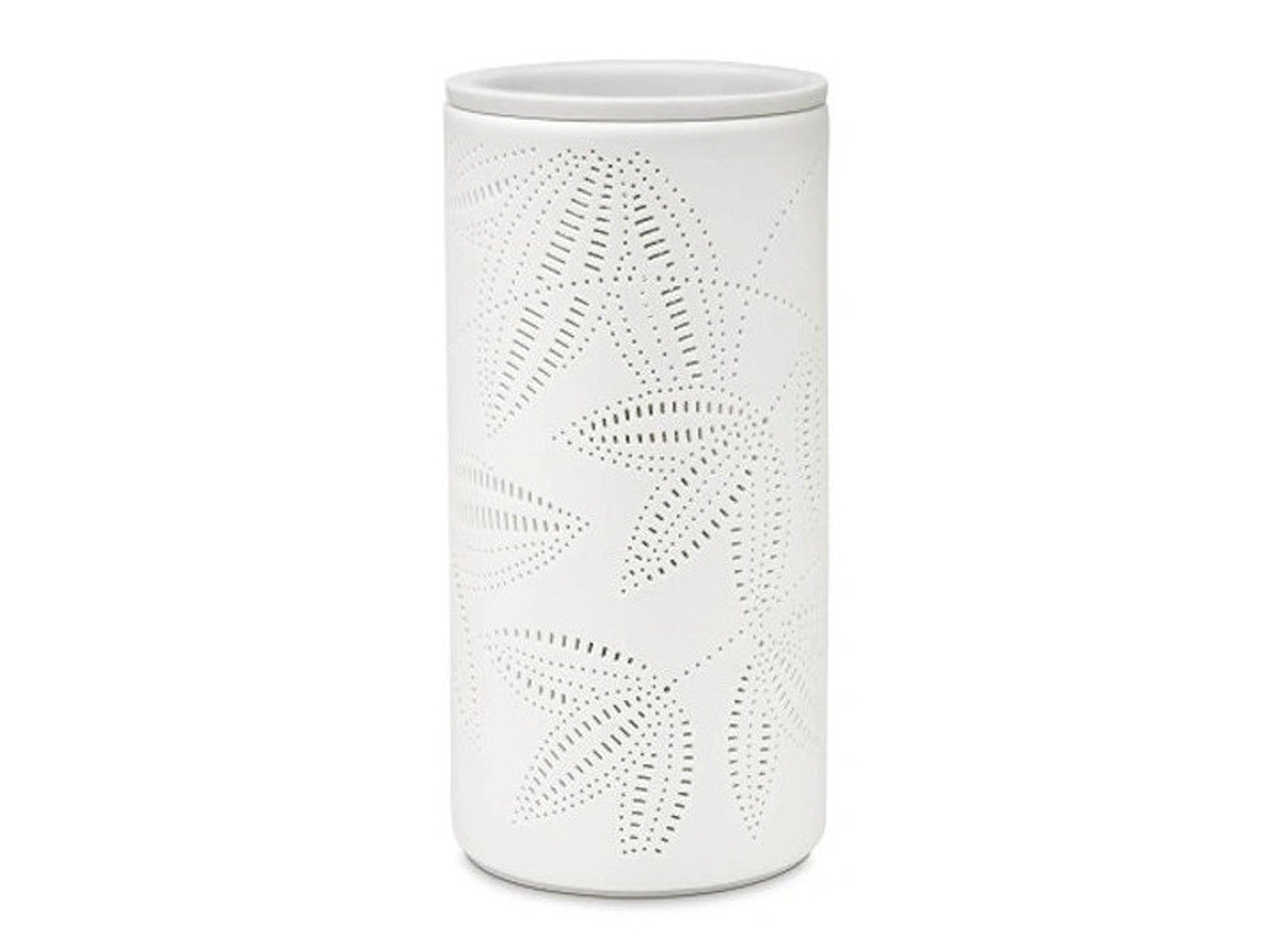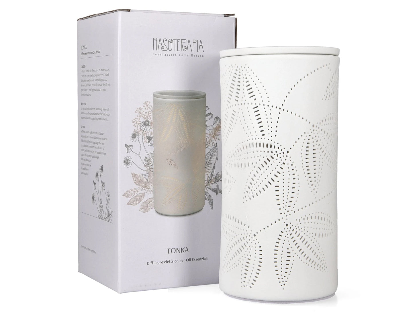 In Tonka, esotiche foglie delicatamente traforate impreziosiscono la ceramica dalla quale, una volta acceso il diffusore, si diffondono suggestivi giochi di luce.