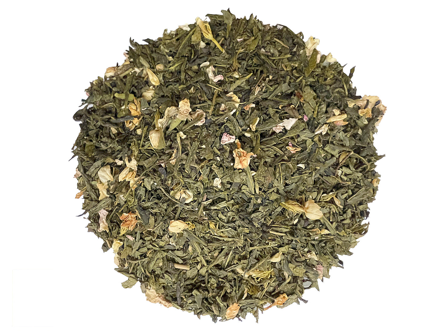 Con: tè verde sencha, tè verde chun mee, tè verde al gelsomino, gelsomino, petali di rosa.