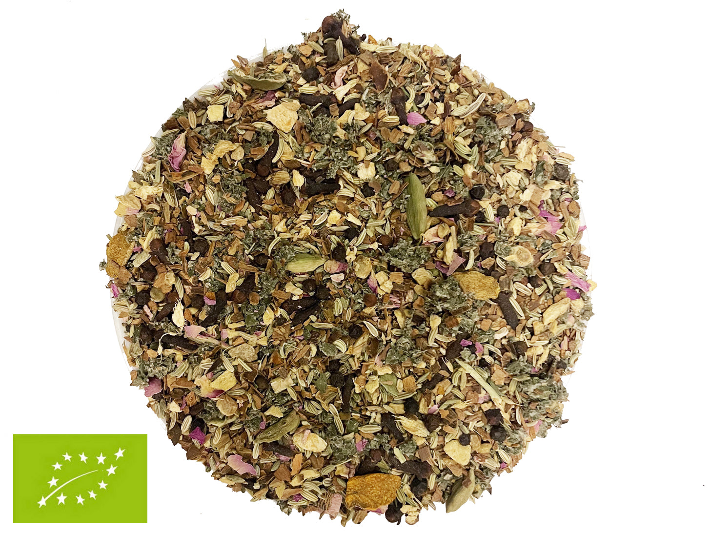 Con: cannella, zenzero, finocchio, chiodi di garofano, foglie di lampone, pepe nero, curcuma, cardamomo. SENZA AROMI